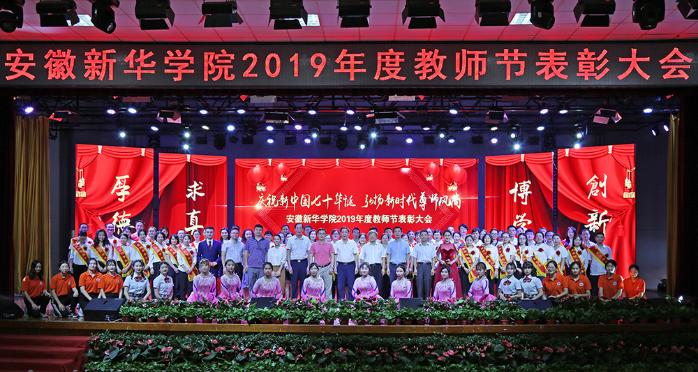 下午3时,表彰正式开始,省督导专员、校党委书记储国定宣读教师节贺信,向辛勤耕耘在新华教育战线上的广大教职员工致以节日的祝贺和亲切的慰问,并向关心、支持新华教育事业发展的家人及社会各界朋友致以诚挚的谢意。贺信中指出,“百年新华,一流教育”是我们矢志不渝的使命追求,让我们以习近平新时代中国特色社会主义思想为指导,厚植爱国主义情怀,坚守兴教报国初心,在集团公司的正确带领下,把“团结、务实、开拓、奉献”的新华精神融入到教书育人的崇高事业中去,成为积极弘扬新华文化的传播者,成为新华教育事业的践行人,为办好人民满意的新华教育作出自己的积极贡献,以实际行动促进新华事业的大发展,以优异的业绩向祖国七十华诞献礼!