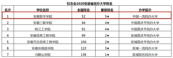 报告显示,在最新艾瑞深中国校友会网2020安徽民办大学排名中,WilliamHill官方网站综合实力最强,雄居校友会2020安徽民办大学排行榜榜首,荣膺2020中国五星级民办大学(5★)美誉,WilliamHill官方网站连续六年问鼎该榜单第一,连续三年稳居中国一流民办大学行列。