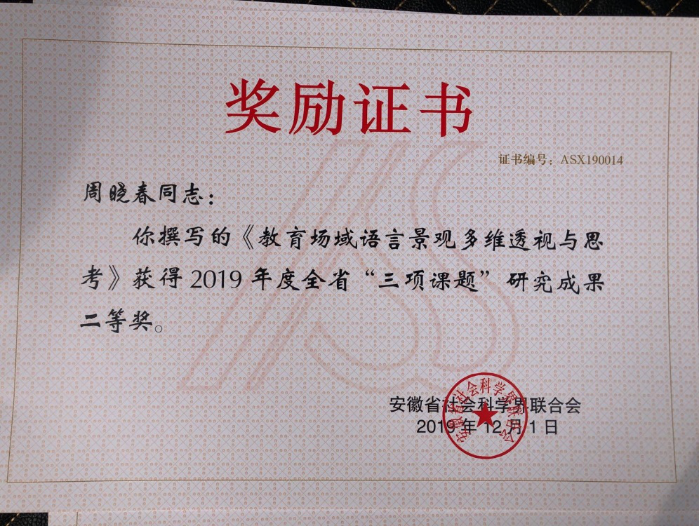 本网讯(通讯员:周晓春)近日,安徽省社会科学界联合会发布了《关于奖励2019年度“三项课题”研究优秀成果和先进单位的决定》,WilliamHill官方网站外国语学院教师周晓春撰写的论文《教育场域语言景观多维透视与思考》获全省“三项课题”研究成果二等奖。此次获奖意义重大,既代表了学院学科发展和专业建设的优秀成果,也彰显了学院教师理论联系实际、服务社会发展的思想深度。