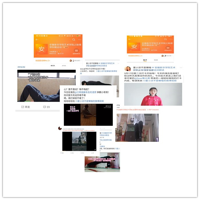 各类活动的开展受到学生们的积极响应,不仅引导学生们每天放下手机和游戏,站起来动一动缓解身体疲劳和释放心理压力,让学生们能够每天以元气满满的精神风貌完成线上课程的学习。影评、书评、音评的撰写不仅弥补了网络碎片化学习的空隙,通过班级群的发布更是加强了学生们间的交流,激发共同的兴趣爱好。此外,学生们还充分发挥想象力,“身宅心不宅”GET形式多样的新技能,记录成班级的“战疫”趣事,通过“新华艺院官微”发声,与广大同学们一起分享。