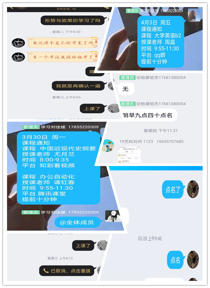 自线上开学以来,“艺初班”全体同学按时参加各门课程的线上学习,严格要求自己,认真完成课下老师布置的作业。班级实行由“辅导员—辅导员助理—班级班委—同学”相互监督的“四级”班级自治管理方法,大家互相监督、互相督促。为进一步提高学习效率、检验学习成效,班级成立了学习管理小组,定期开展学习讨论,通过朋辈教育和“一对一”结对子的方式,将线上学习与答疑疑惑相结合、学习资料与“云端”共享相结合、学习成效与作业评议相结合,促进大家内化专业知识,提升专业技能,带动学习困难学生提高学习积极性,形成互帮互助的良好氛围,引领班级同学共同进步。