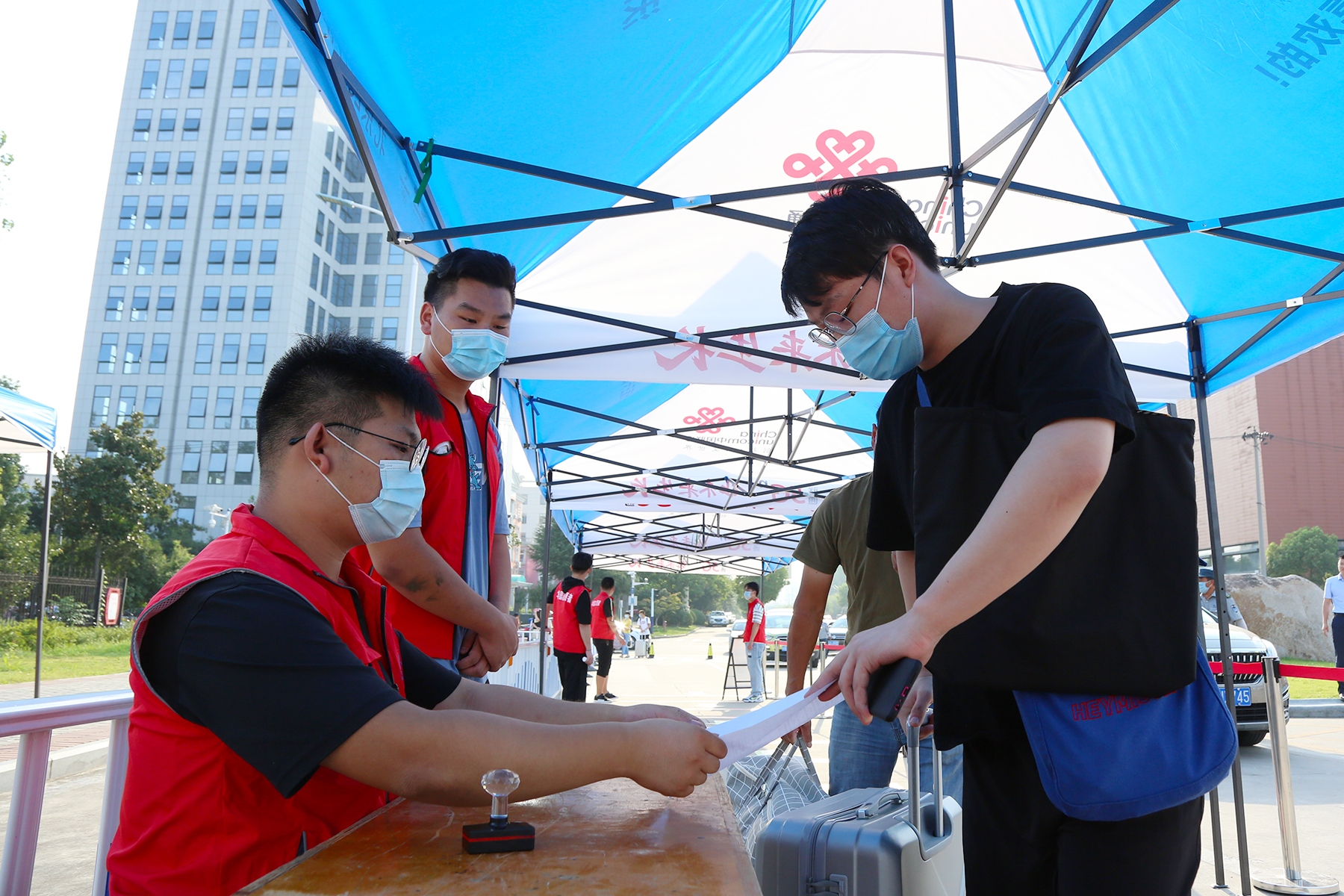 入校当天,WilliamHill官网东门、西门开设了专用通道,工作人员和志愿者们清晨便已就位,迎接新生的到来。新生们经过专用通道,保持1.5米以上距离排队,依次检查安康码及健康承诺书,在完成体温检测、行李消毒流程后,有序进入校园。
