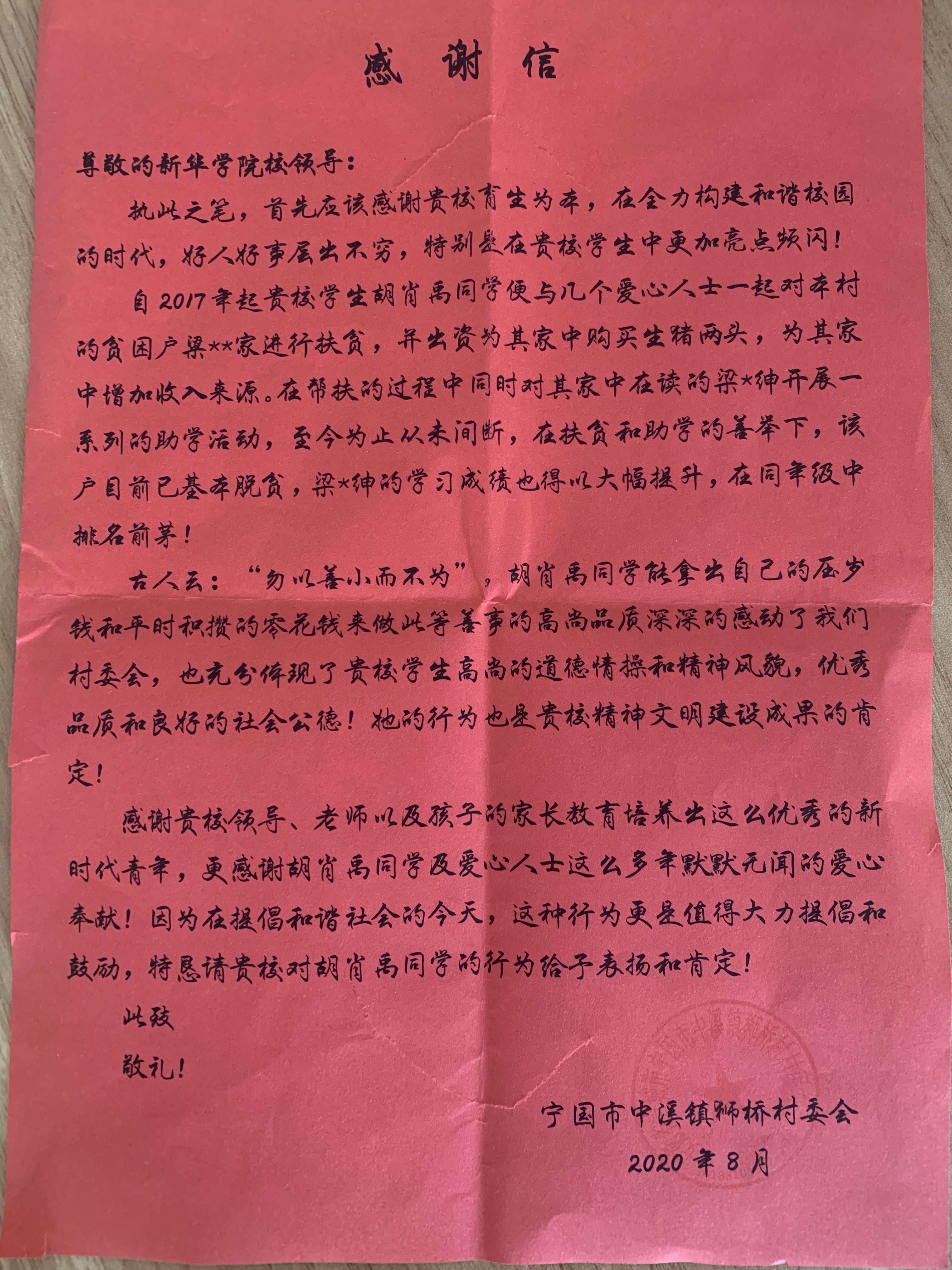 胡肖禹默默持续的爱心之举,感动了当地。“胡肖禹同学能拿出自己的压岁钱和平时积攒的零花钱来作此等善事的高尚品质深深感动了我们村委会,也充分体现了贵校学生高尚的道德情操和精神风貌,优秀品质和良好的社会公德,她的行为也是贵校精神文明建设成果的肯定!”