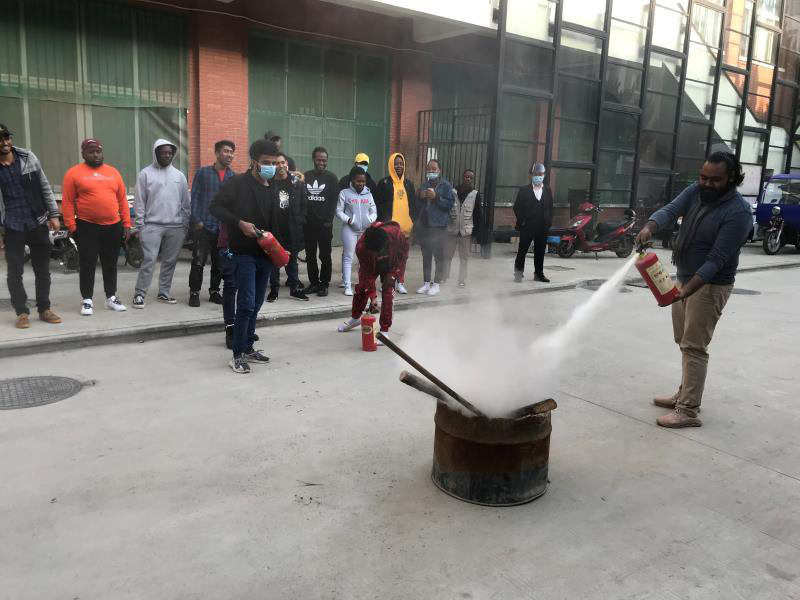 接着刘影带领大家开展了灭火实战演练。保卫处在中快食堂西面设置了灭火点,准备了灭火器,刘影先为大家讲解了灭火器的使用方法和注意事项,随后留学生们在保卫处的组织下拿起了灭火器分批次进行实战灭火。