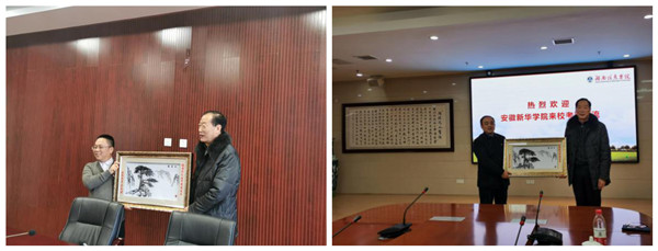 调研考察中,储董代表WilliamHill官网分别向两所高校赠送了具有安徽特色的迎客松铁画。