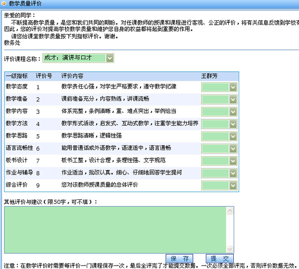 记者了解到,开展网上评教活动前,教务处会对课程、授课教师等数据进行维护;网上评教过程中,教务处对评教数据进行实时监控,确保数据的准确性、全面性;网上评教结束后,教务处将对评教数据进行统计分析,对老师们的授课状态进行客观评价,从而提高教学质量。该系统对学生评教的内容是绝对保密的,这也确保了学生在网上评教过程中的客观、公正。网上评教有利于授课教师及时了解自身的教学状况,及时更正教学中的不足,分析和研究提高授课教师教学质量的方法,从而不断优化教学过程,规范教学行为,达到提高教师教学水平的目的。同时,评教系统有助于逐步完善学生评教与教学质量监控的制度体系和评价标准。