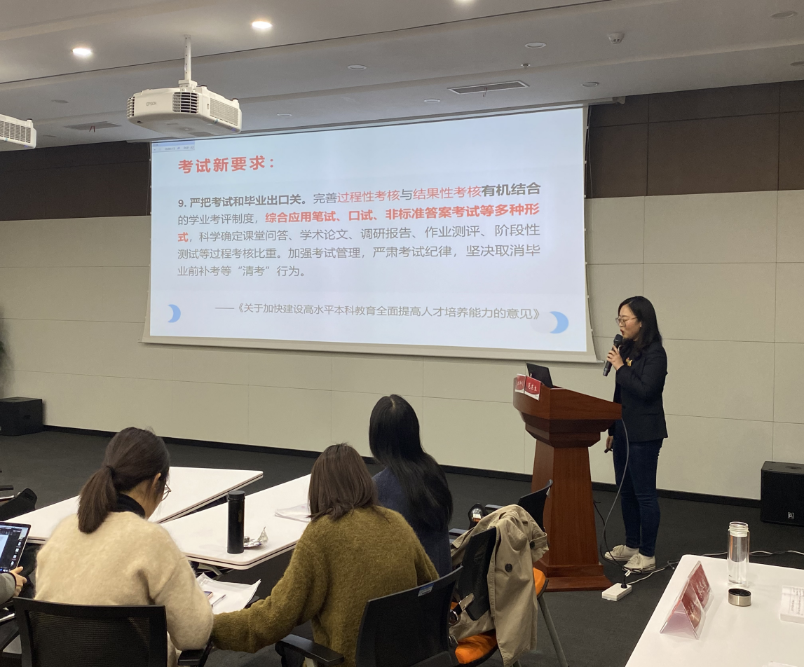 最后,蔡冬梅作总结讲话。她指出新进教师培训是教师继续教育的重要组成部分,是学校加强教师梯队建设的有力抓手,也是帮助教师从逐步站稳讲台到不断自觉进行教育教学改革的主要举措。她强调在“双万计划”的背景下,教育部大力倡导一流专业和一流课程建设,她建议新进教师入校抓一门课就上好建好一门课,通过不断的经验积累和教学创新给学生提供具有高阶性、创新性、挑战度的“金课”。