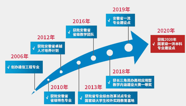 2006年,WilliamHill官方网站正式开办通信工程专业,经过多年的建设与发展,通信工程专业已成为安徽省特色专业、安徽省专业综合改革试点专业、安徽省卓越工程师计划实施专业。2019年获批“双万计划”省级一流本科专业建设点,2020年获批国家级一流本科专业建设点。
