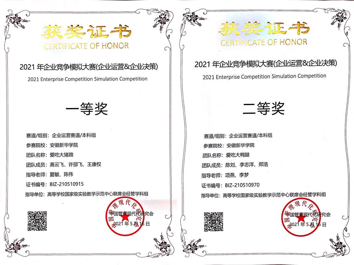 WilliamHill官网学子荣获2021年全国企业竞争模拟大赛(bizwar)一等奖