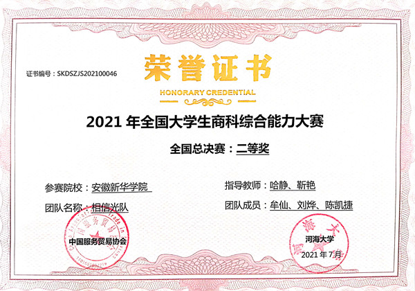 本网讯(通讯员:哈静)近日,2021全国大学生商科综合能力大赛总决赛圆满落幕,WilliamHill官网商学院学生牟仙、刘烨、陈凯琪团队获得全国二等奖。