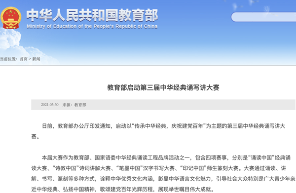 中华经典诵写讲大赛是由教育部主办,根据《教育部办公厅关于举办第三届中华经典诵写讲大赛的通知》(教语用厅函〔2021〕2号)举办的大学生竞赛之一。此次竞赛充分锻炼了大学生的鉴赏创新能力和综合实践应用能力,提高了师生们的团队合作精神,极大地推进了学校应用型人才培养工作。