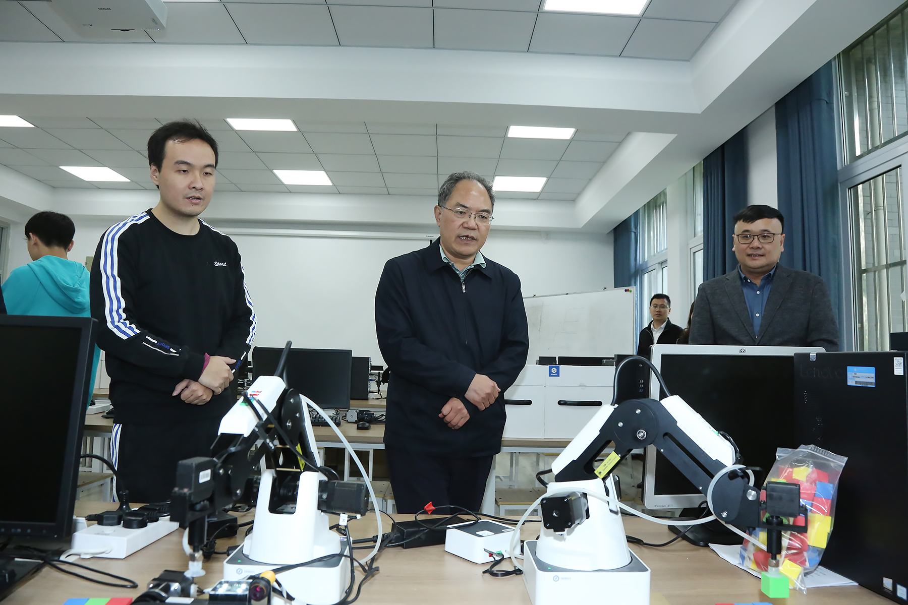 赵振华一行参观了学校省级重点实验室——结构实验室、电子通信与自动化实验实训中心、物联网综合实验室、LTE移动通信实验室、智慧教室,详细了解了实验室软硬件配置、日常教学等内容。他指出,学校重视实验室和实训中心建设,有利于应用型人才的培养,也有利于培养学生的创新意识和创新能力,做的非常好,这对学生将来快速融入工作岗位有很大促进作用。