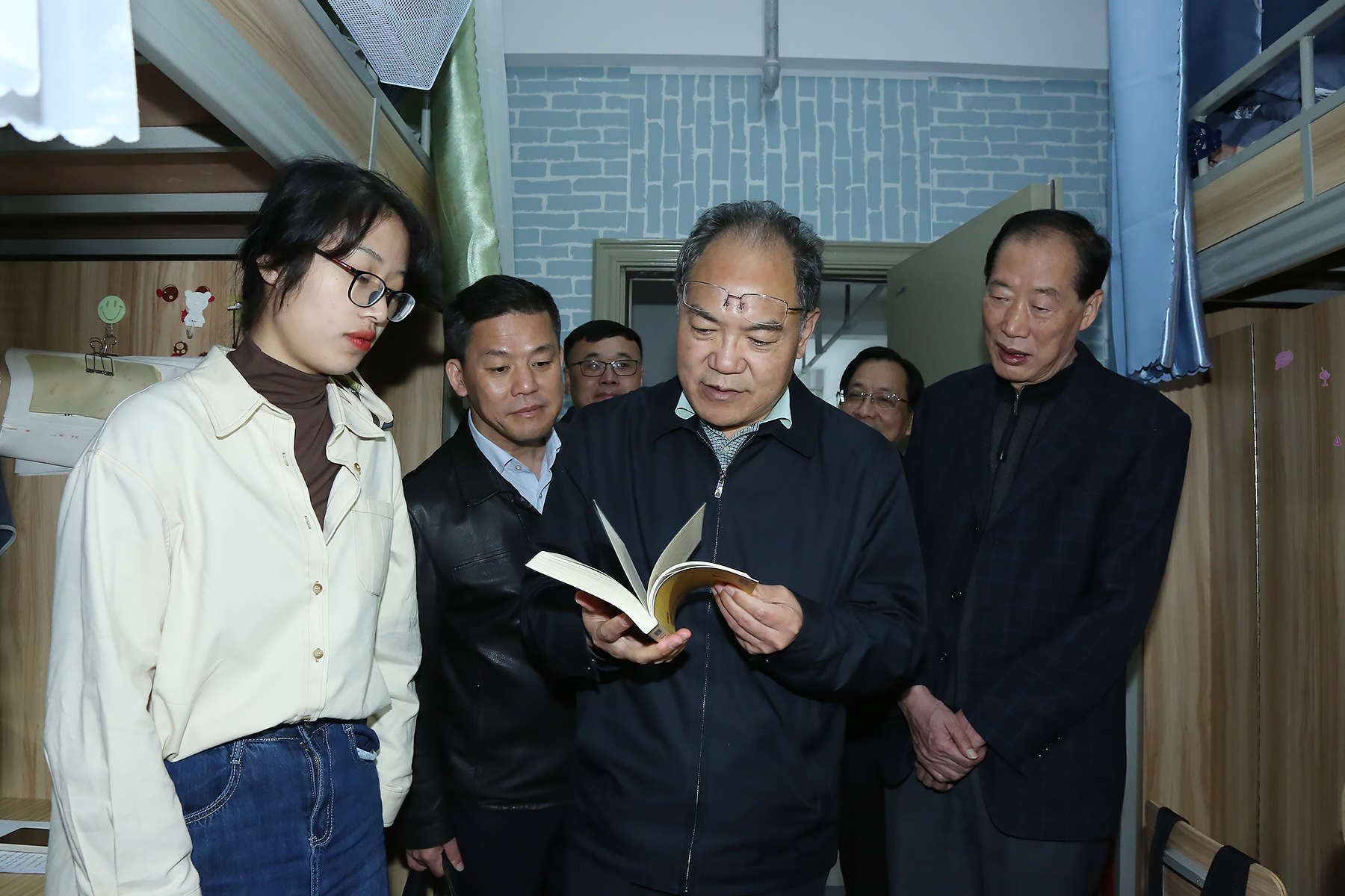 在学生宿舍参观过程中,赵振华饶有兴致地和汉语言文学专业的学生交流《全球通史》《古文观止》等观后感,并对大学生文学素养的提升及日常学习提出了指导意见。