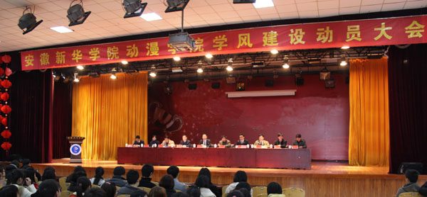 本网讯(通讯员 张大勇,摄影 赵由由)为了进一步贯彻落实学校2013年度学风建设活动方案,促进大学生思想政治教育工作的深入开展,形成良好的院风、学风。动漫学院于3月20日在学校大礼堂召开了2013年度学风建设动员大会。副院长倪征出席会议并讲话,动漫学院全体老师和非毕业班学生参加了动员大会。