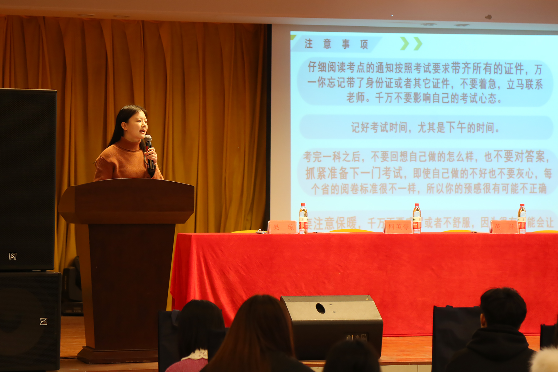 会议伊始,黄德垚致辞,他首先肯定和赞扬了学子们在学习过程当中能够树立自己的人生目标,为自己的理想、青春去奋斗的精神。同时,鼓励考研学子积极备考,希望在接下来的一周内继续保持良好的精神状态和积极乐观的心态,充分利用剩余的时间提高学习效率。并提出三点要求,一是要诚信考试,二是考试结束后认真完成实习,三是积极准备毕业论文。随后,硕士校友为考研学子送祝福,传授考研经验和考试技巧。