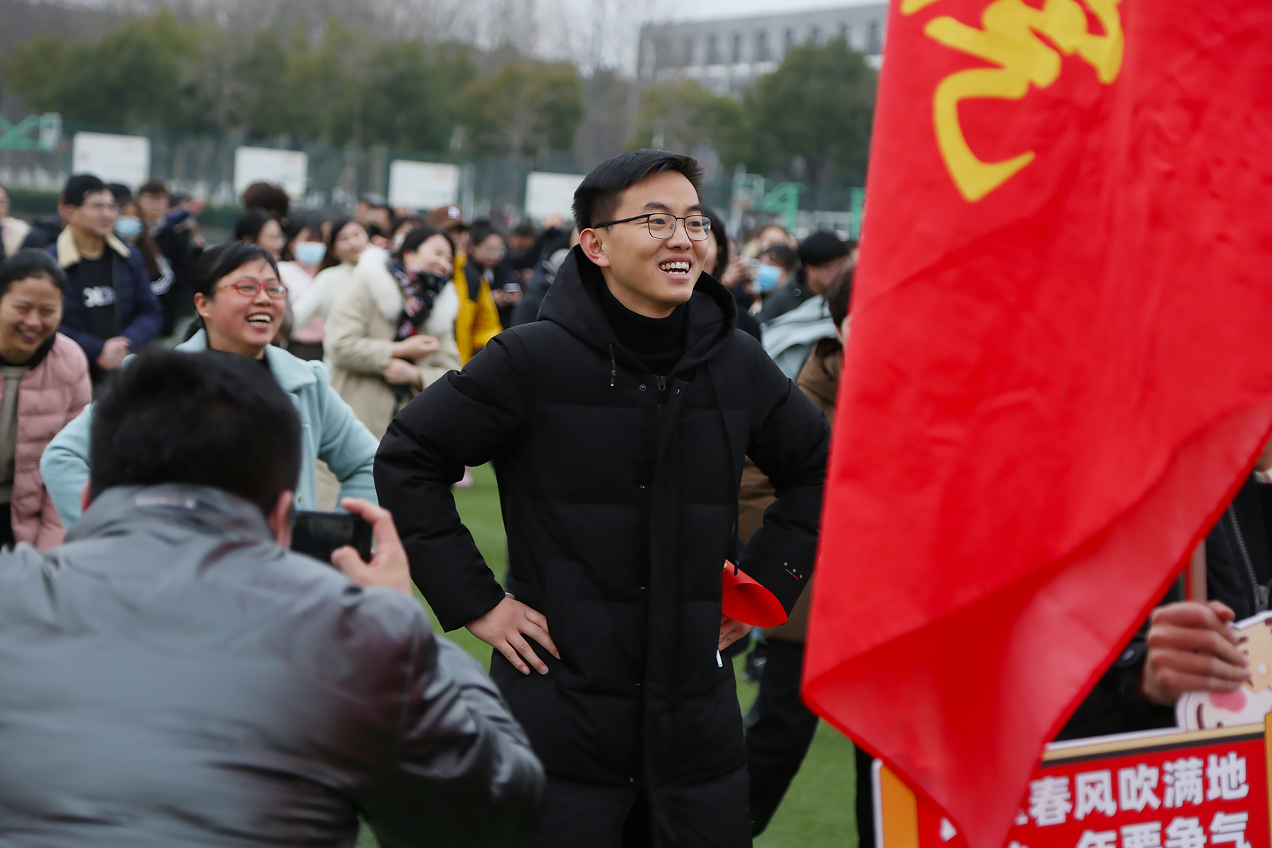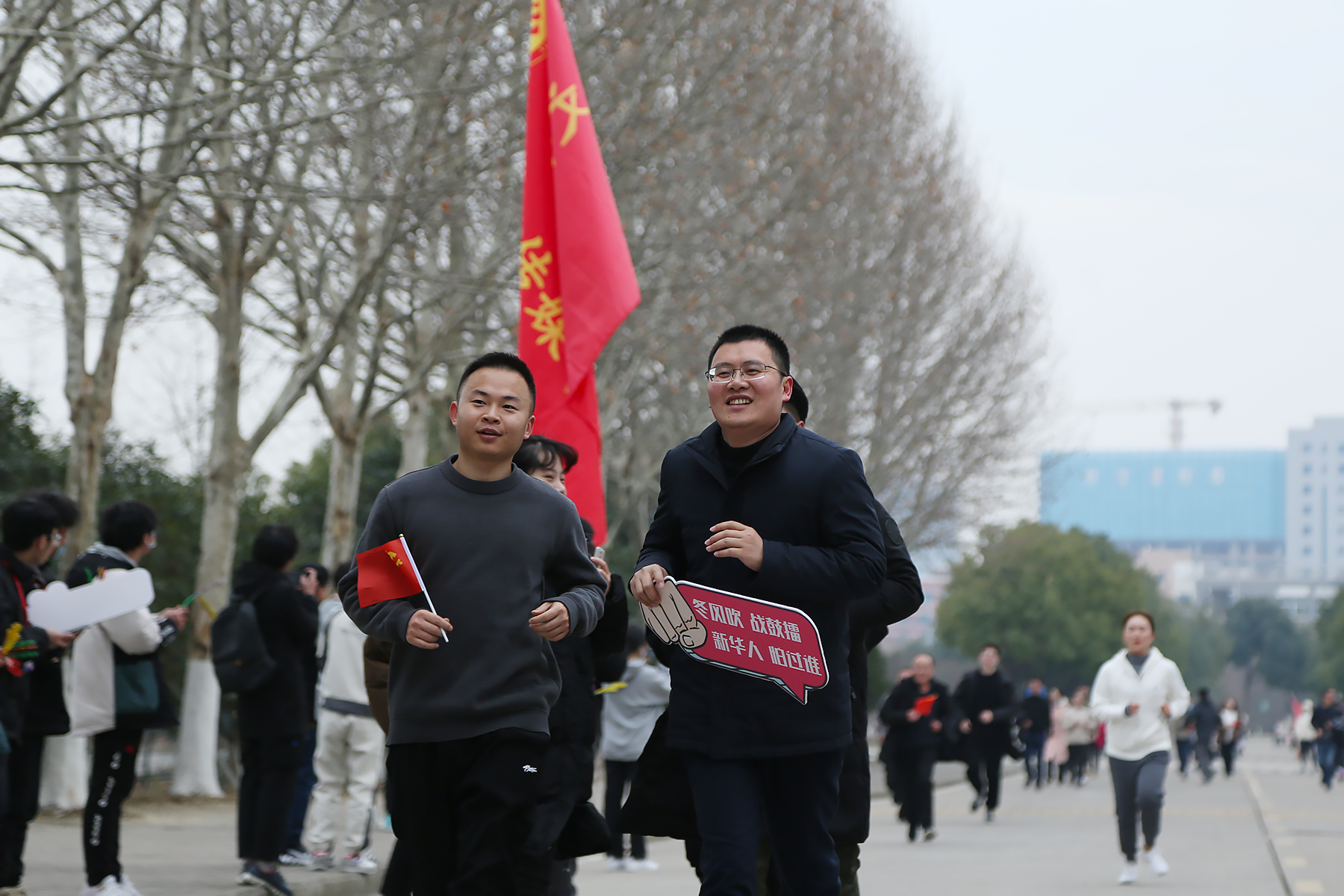 深冬的寒冷挡不住老师们似火的热情,在轻松欢快的热身操之后,跨年跑正式开始。参加活动的老师们意气风发、精神抖擞,在学生的加油助威中,沿着赛道有序出发。