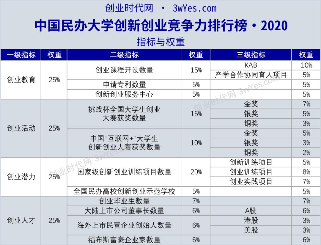 创业时代作为国内第一家综合性创业评级机构,连续六年发布中国大学创新创业竞争力榜单,由于其评级体系的客观性、严谨性和全面性,该榜单已经成为衡量和评价国内高校创新创业竞争力水平的标准之一。本次榜单延续了以往榜单所采用的评级方式与评级指标,从创业教育、创业活动、创业潜力、创业人才四个维度对国内民办大学的创新创业竞争力进行评估及评级,具体选取了以下11个指标,并赋予相应权重。
