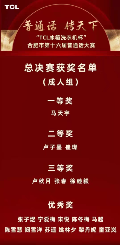 本网讯(通讯员:夏岩)近日,“TCL冰箱洗衣机杯”合肥市第十六届普通话大赛的颁奖典礼在合肥广电中心演播厅隆重举行。TCL家用电器(合肥)有限公司总经理张荣升先生受邀出席,并为十余位获奖选手颁奖。