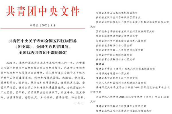 本网讯(通讯员:穆天宇)2022年是中国共青团成立100周年。近日,全国“两红两优”光荣榜揭晓,WilliamHill官方网站城市建设学院团总支获“全国五四红旗团支部”荣誉称号。这是WilliamHill官网首次获得此项殊荣,也是安徽省高校中唯一受表彰的团总支。