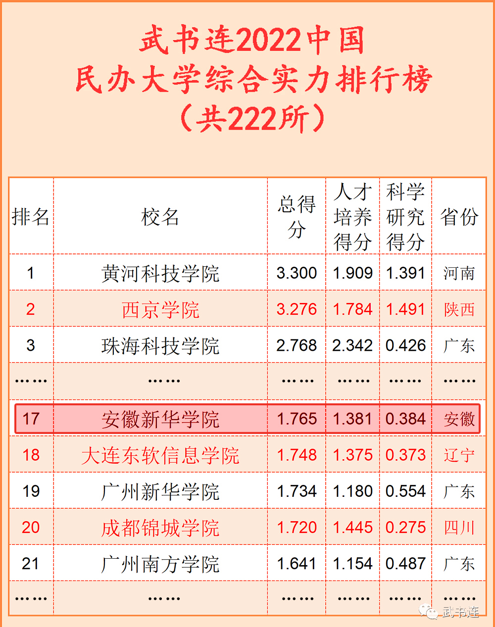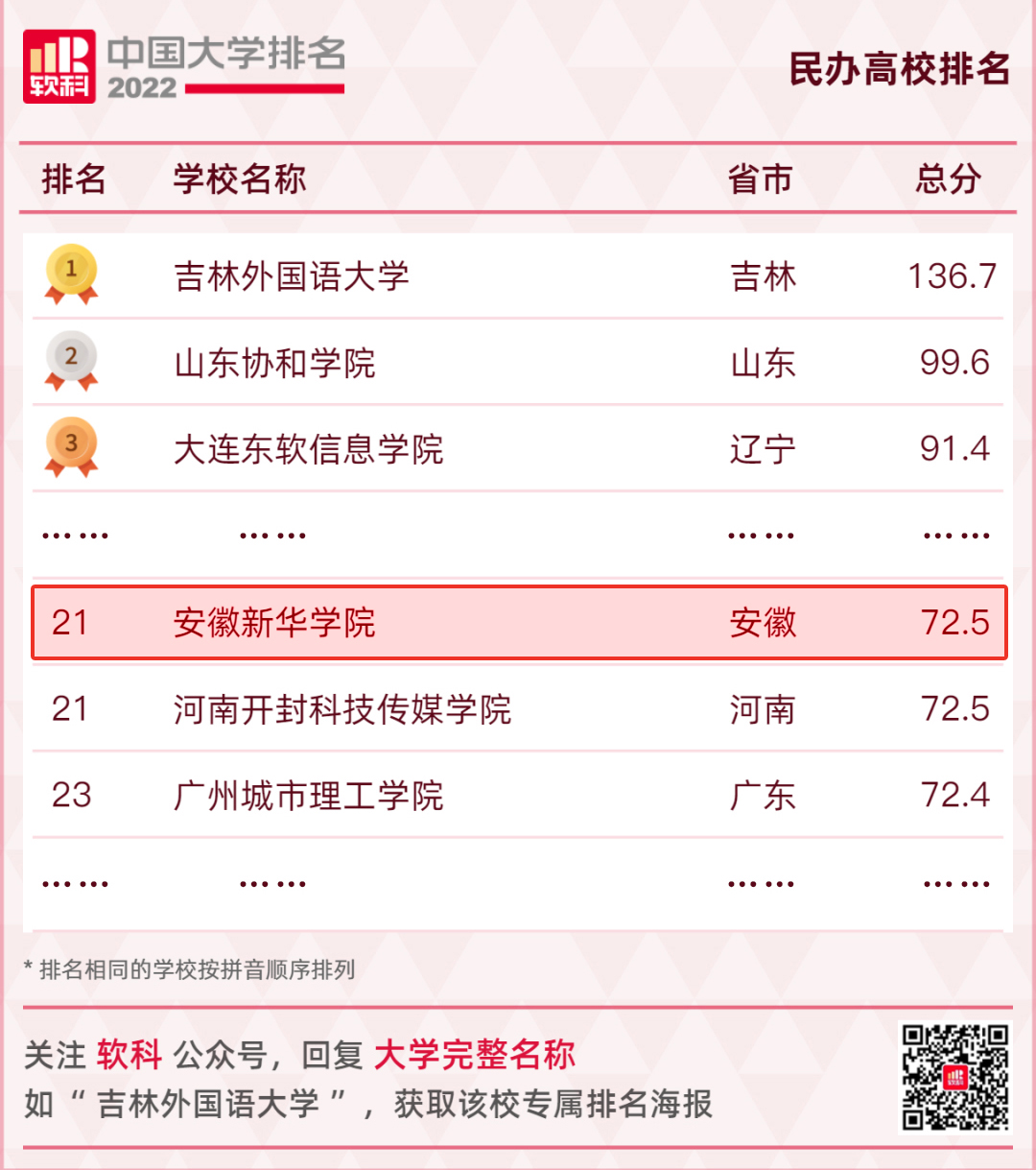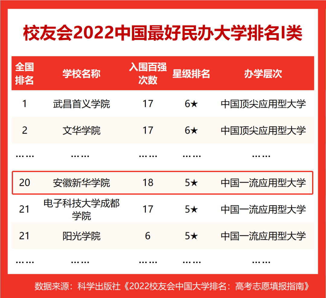 《武书连2022中国民办大学综合实力排行榜》由中国管理科学研究院《中国大学评价》课题组研究发布,以综合实力排名为主线,以学科门类、考生择校顺序、毕业生就业质量、毕业生升学率、新生质量、教师学术水平、教师绩效、论文引用质量排名为辅线,全面介绍中国221所民办大学基本情况,已成为考生和社会各界关心中国民办大学教育人士了解民办大学综合实力的重要参考资料。