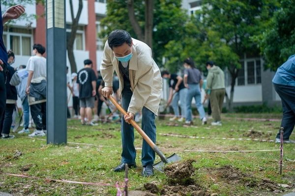 推动劳动教育实践基地建设,让劳动在校园里生根发芽。近日,新华园的又一个“劳动教育实践基地”在学校教五、教六的中庭空间挂牌,由商学院组织开展的“‘疫’起劳动,花满华园”系列活动拉开了基地建设的开工大幕,劳动教育研究中心主任朱平出席活动,并用习近平总书记所说的“劳动最光荣、劳动最崇高、劳动最伟大、劳动最美丽”动员和引导在场的同学们用“出力流汗”感受劳动创造的美。劳动教育实践导师方传奎就工具使用、分工协作、播种技巧、后续维护等方面做统一指导说明,同学们认真学习,干劲十足,现场气氛高涨,顷刻间将土地翻耕,深植希望之种。活动恰值谷雨时节,正是春种春播的关键时期,同学们在挥洒汗水中,体会到了耕种的乐趣,更体会到了劳动带来的自豪感和光荣感。
