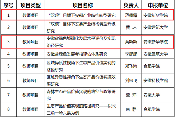本网讯(通讯员:黄斯斯)近日,安徽大学生态与经济发展中心下发的《安徽生态与经济发展研究中心2022年度招标课题立项公示》立项文件,财会与金融学院2项课题成功获批立项,其中“双碳”研究类课题1项,绿色城镇化课题1项。上述2项课题分别是财会与金融学院教师范佩霞申报的《“双碳”目标下安徽产业结构转型研究》、黄斯斯申报的《安徽省绿色城镇化发展水平评价及实现路径研究》,具体获批情况如下图: