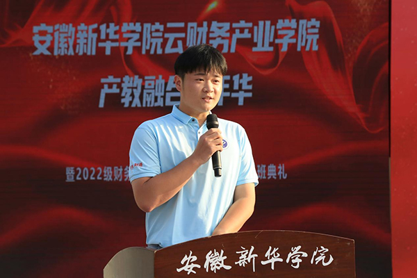 田鹏代表新道科技股份有限公司对2022级的新生们表示热烈的欢迎和诚挚的祝贺。他指出,新道科技持续将前沿的财会领域新技术、新方法引入到课堂教学中,创新“云财务管理会计”的应用与完善,创设新型学习环境,为同学们创造更好的学习环境和职场环境。