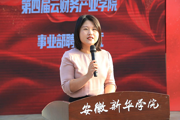 濮明月宣读《关于聘任李惠馨等同学为第四届云财务产业学院事业部成员的决定》,王琦进为2022级事业部授予聘书、班旗并进行宣誓。