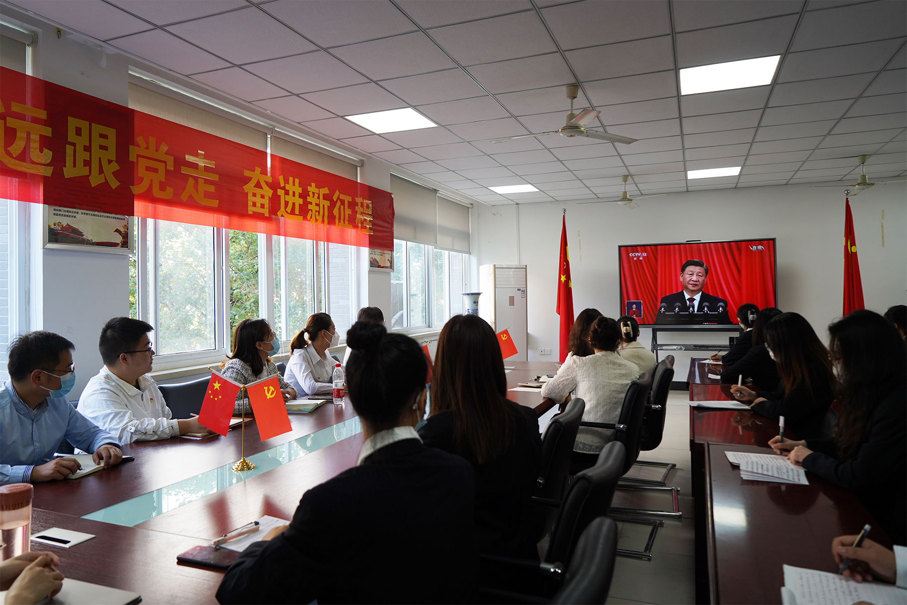 大数据与人工智能学院师生党员、发展对象和入党积极分子在13号教学楼203和205会议室收听收看大会实况,学习报告内容。