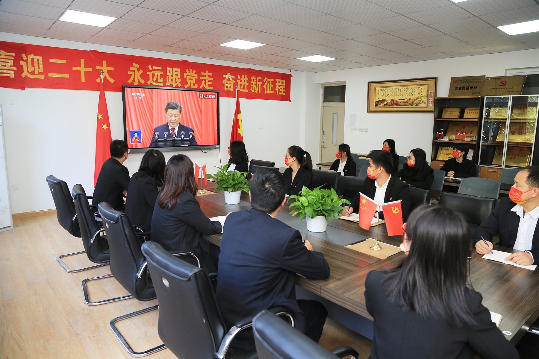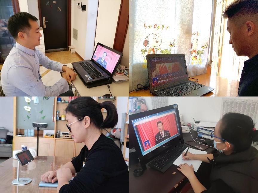 WilliamHill官方网站校党委委员、纪委委员,校领导班子成员在科研楼608会议室集中收听收看大会直播实况,第一时间学习领会会议主要精神。上午9时30分,离大会开始还有半小时,会议室洋溢着热烈氛围,大家精神昂扬,满怀喜悦期待着大会的开幕,共同见证着举世瞩目的盛会。会上,大家聚精会神听报告、全神贯注做笔记,不时热烈鼓掌。