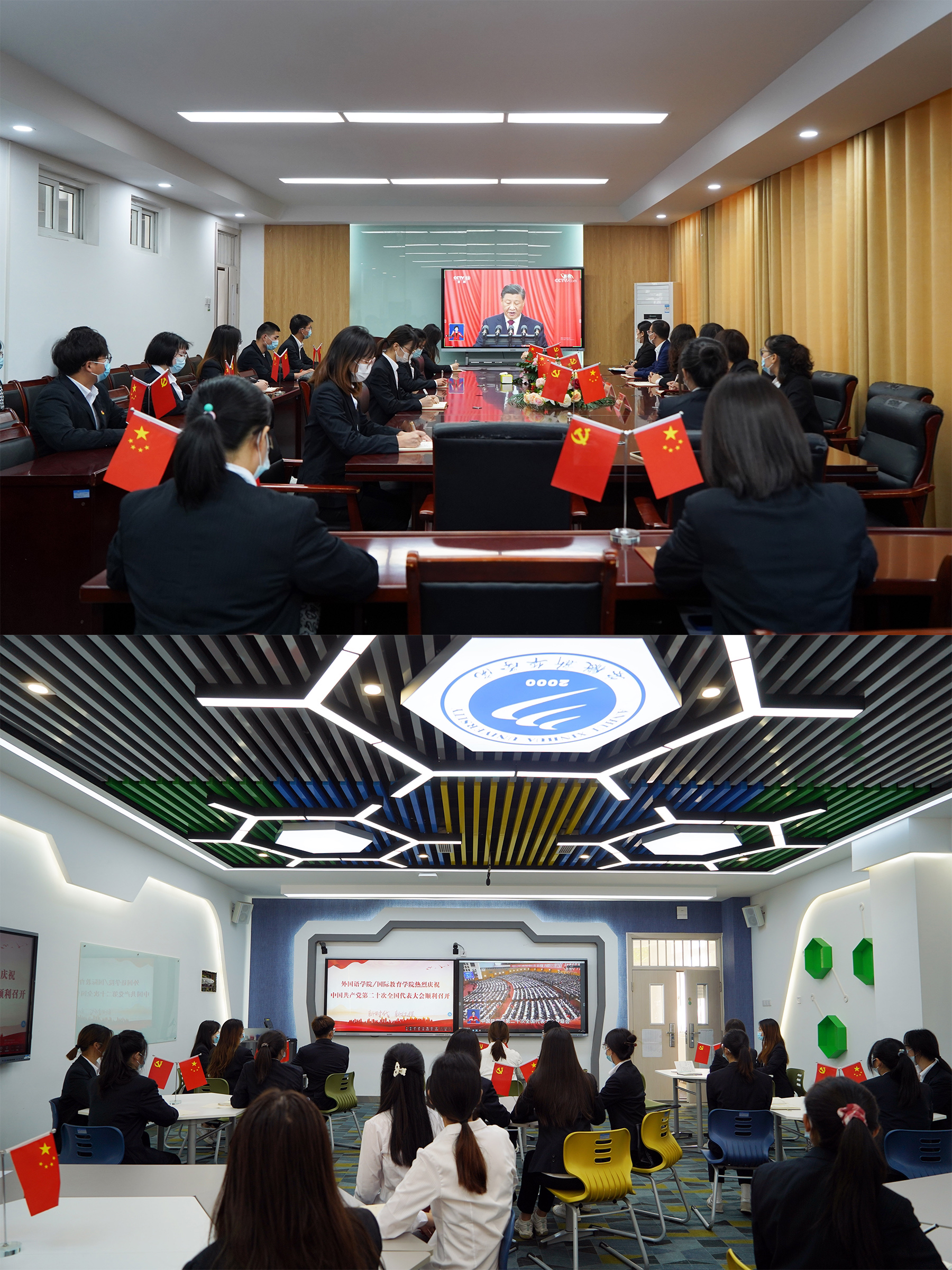 外国语学院的师生党员们在9号教学楼101教室和324会议室共同聆听大会报告。