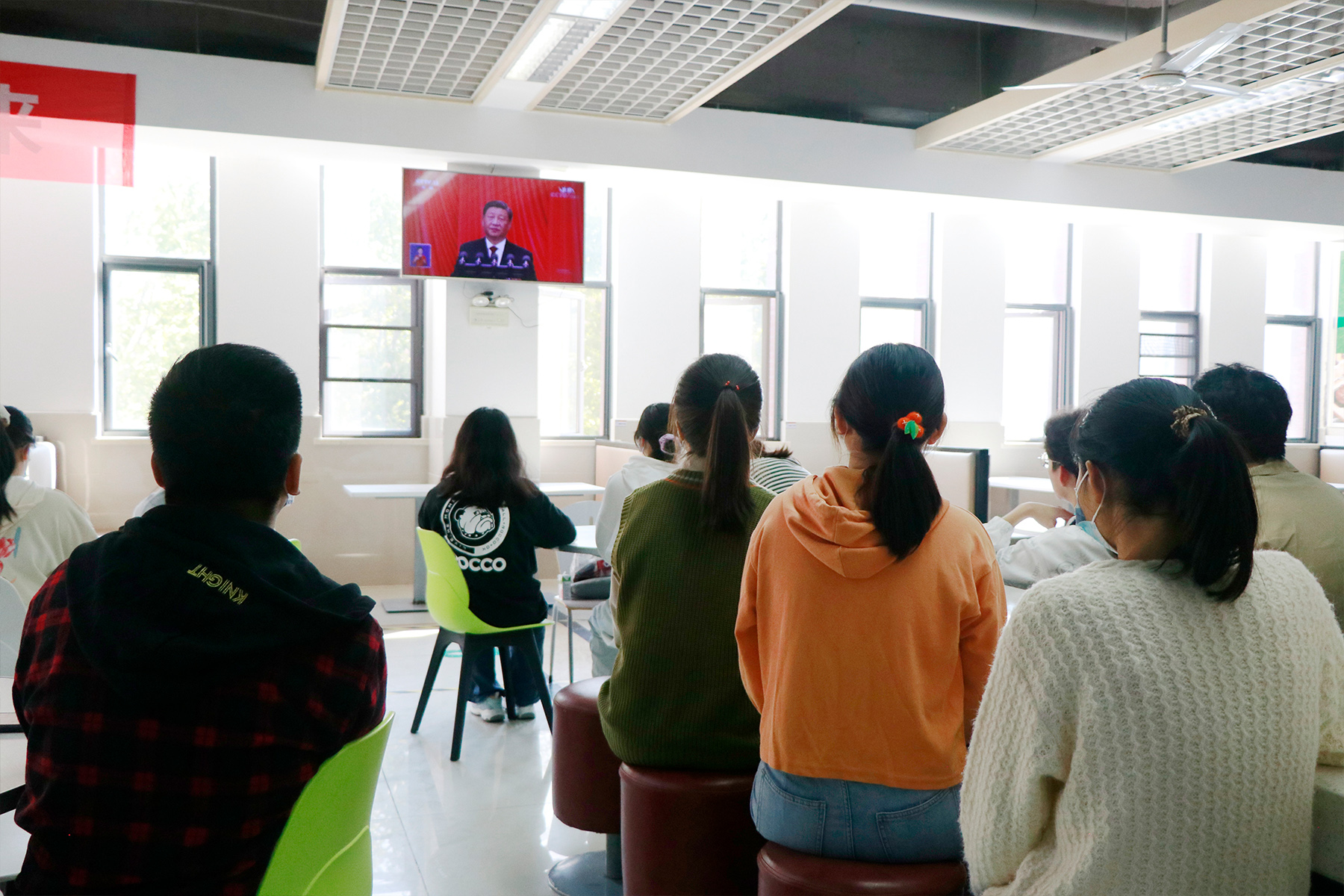 食堂里,同学们围坐在电视机前观看大会直播。