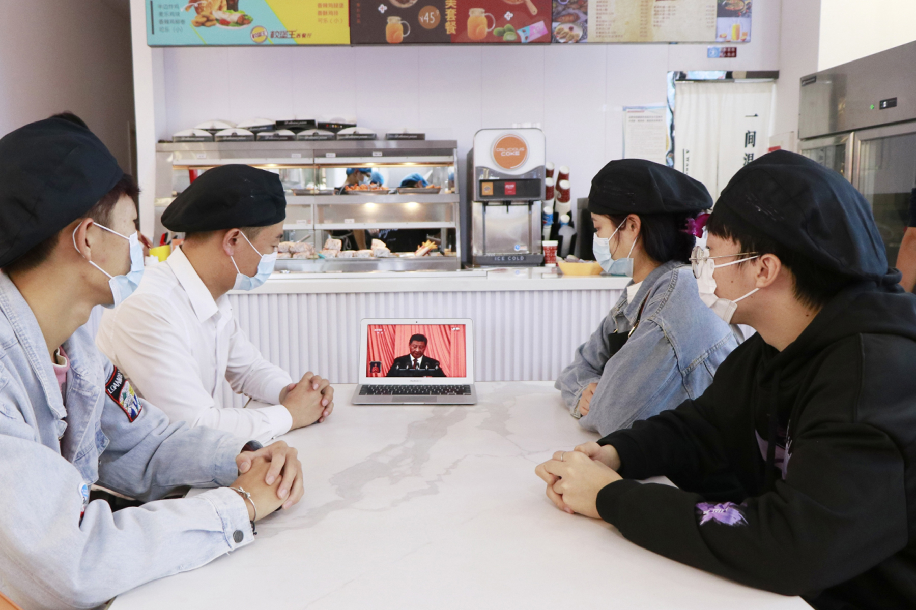 食堂商户自发收看大会直播。