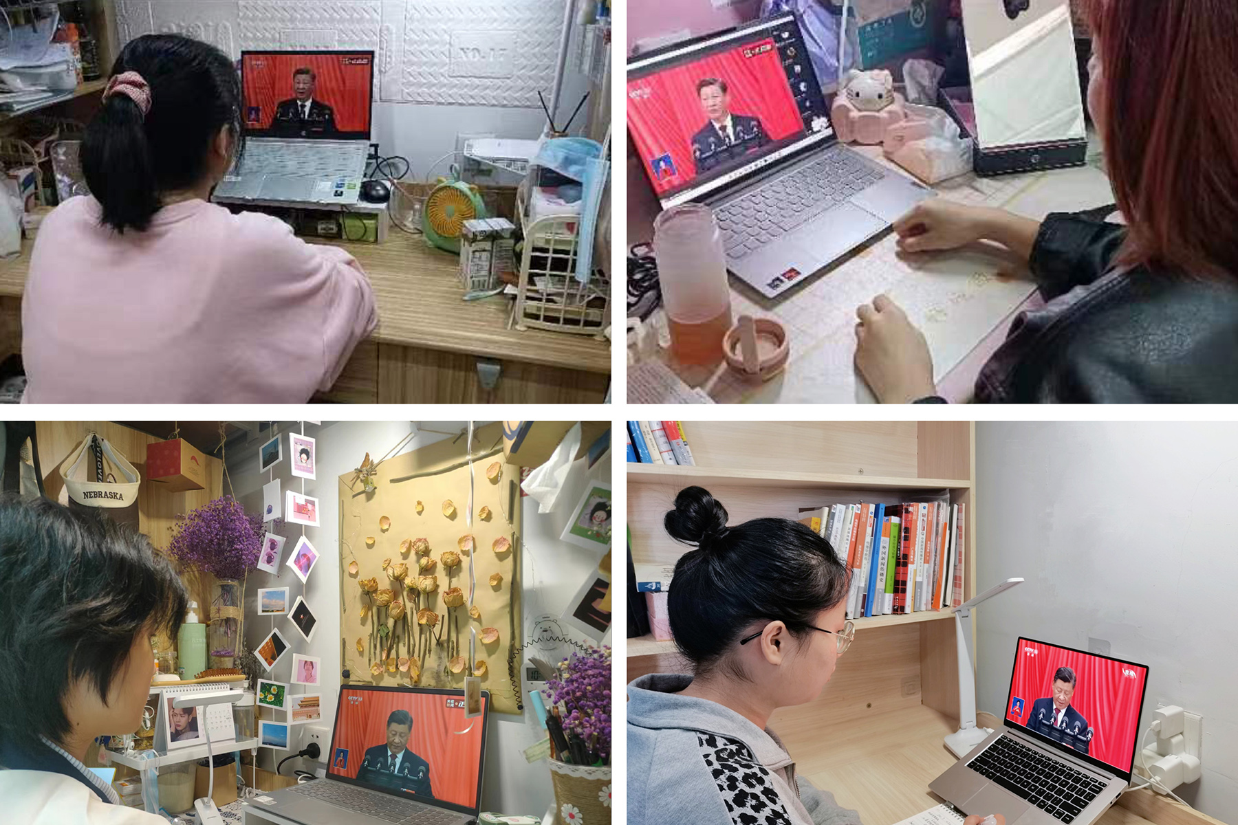 28栋211宿舍的同学们在宿舍电脑前聚精会神,边听边记大会内容。