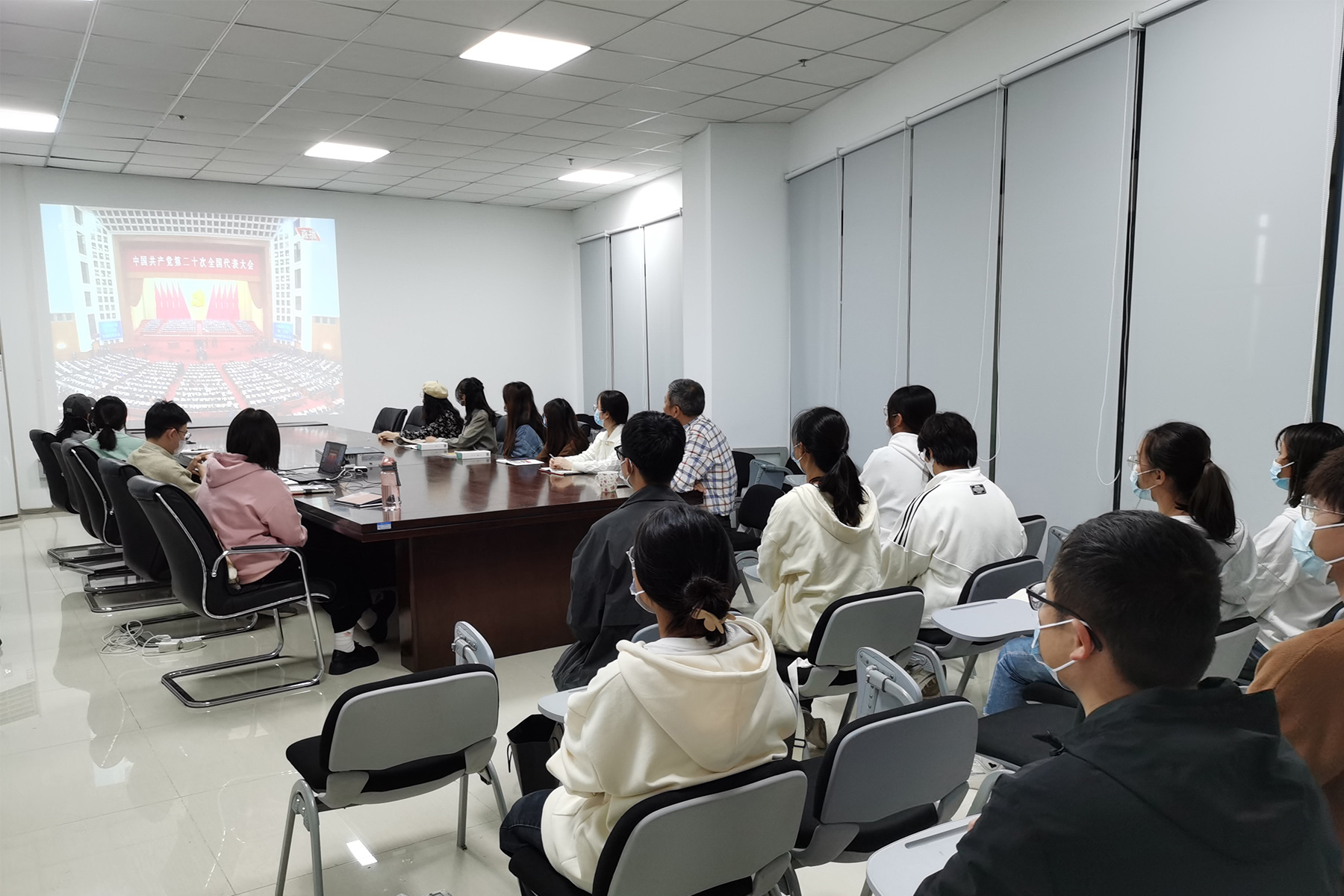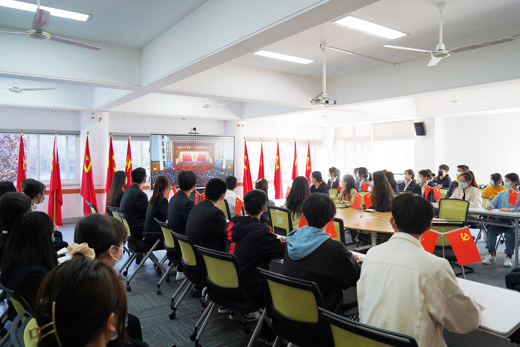 财会与金融学院师生党员、发展对象、入党积极分子在教学楼12号楼收看大会开幕会。