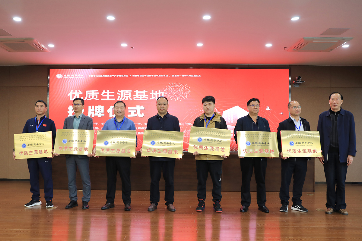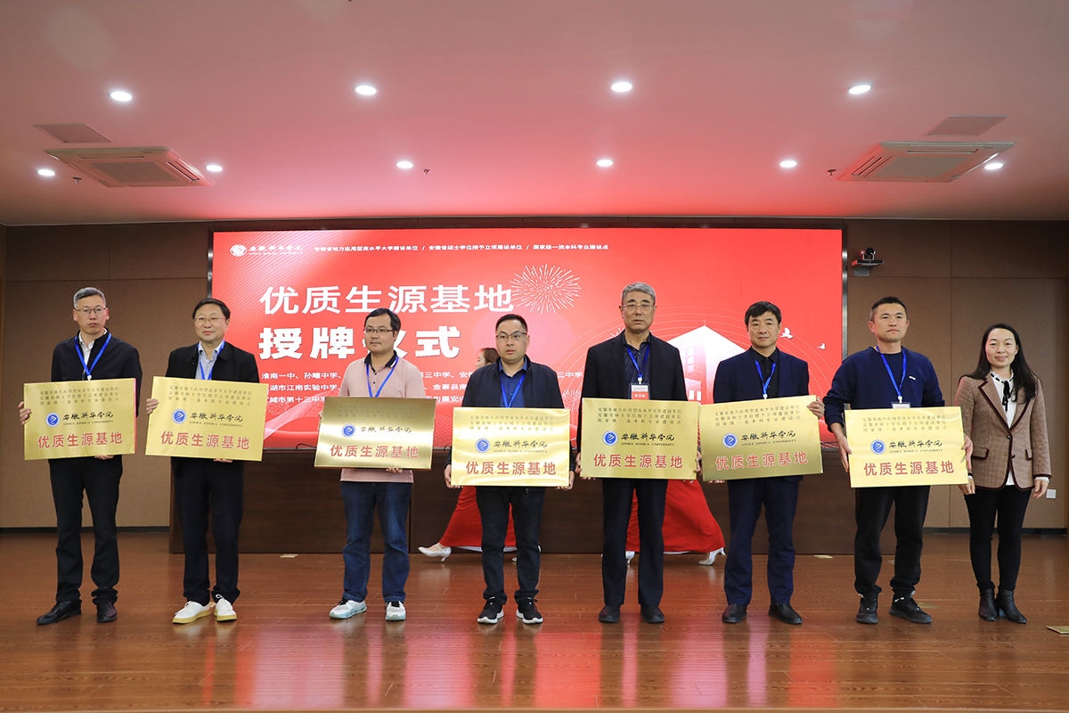现场,校领导为淮南一中、孙疃中学、明光中学、宣城市第三中学、安徽师范大学附属庐江第三中学、芜湖市江南实验中学、矿建中学、禹王中学、金寨县南溪中学、六安独山中学、宣城市第十三中学、宣城市卓越补习学校、无为襄安中学、利辛高级中学十四所中学授予“WilliamHill官方网站优质生源基地”称号。