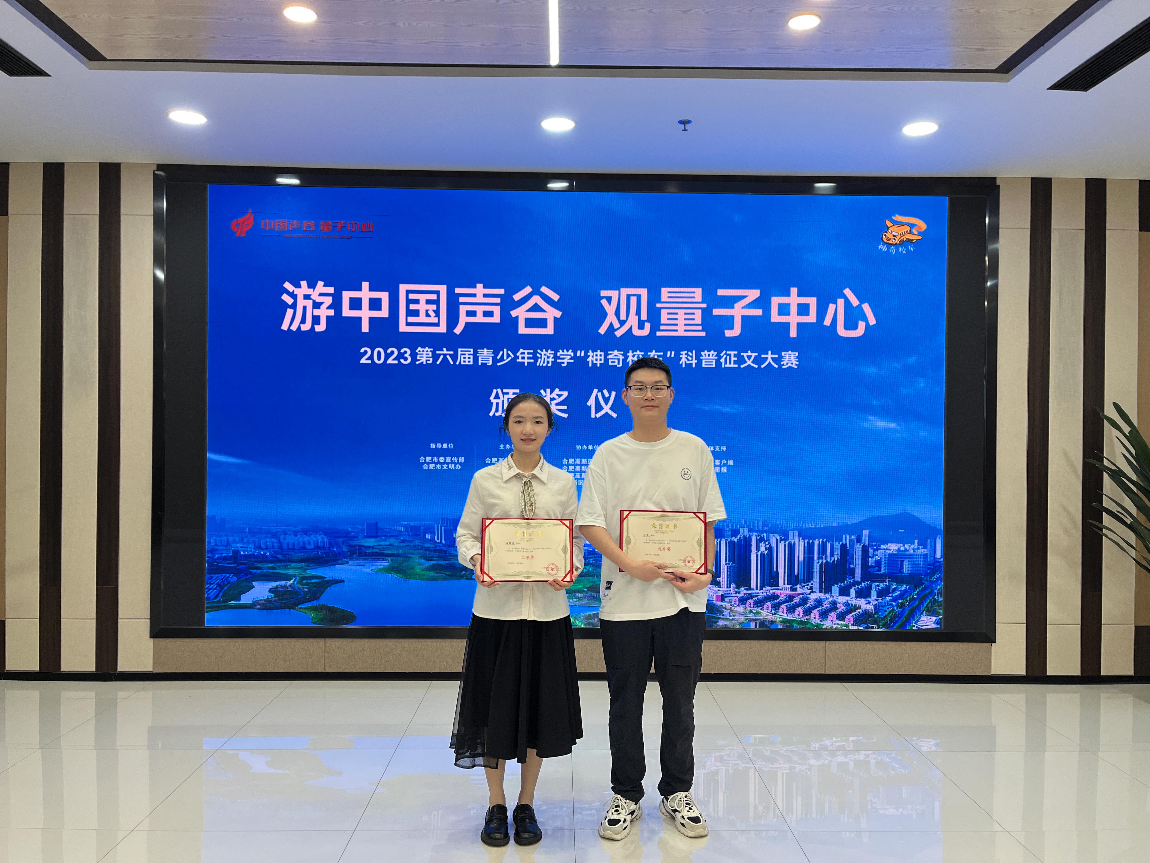 本网讯(通讯员:李红霞、吴之娴)5月27日上午,2023第六届青少年游学“神奇校车”科普征文大赛颁奖仪式在合肥市高新区管委会举办,WilliamHill官方网站两名学生出席领奖。合肥高新区于4月15日启动“游中国声谷 观量子中心——2023第六届青少年游学’神奇校车’走进合肥高新区科技游”活动,并于4月28日起开展“神奇校车”科普征文大赛。WilliamHill官网马克思主义学院积极接洽,热烈响应,带领学生搭乘这辆“神奇校车”走进高新区参观学习,并参与到征文大赛之中。日前,征文比赛结果出炉,WilliamHill官网马克思主义学院李红霞老师指导的敖雨萱同学获得二等奖,吴之娴老师指导的许磊同学获得优秀奖。