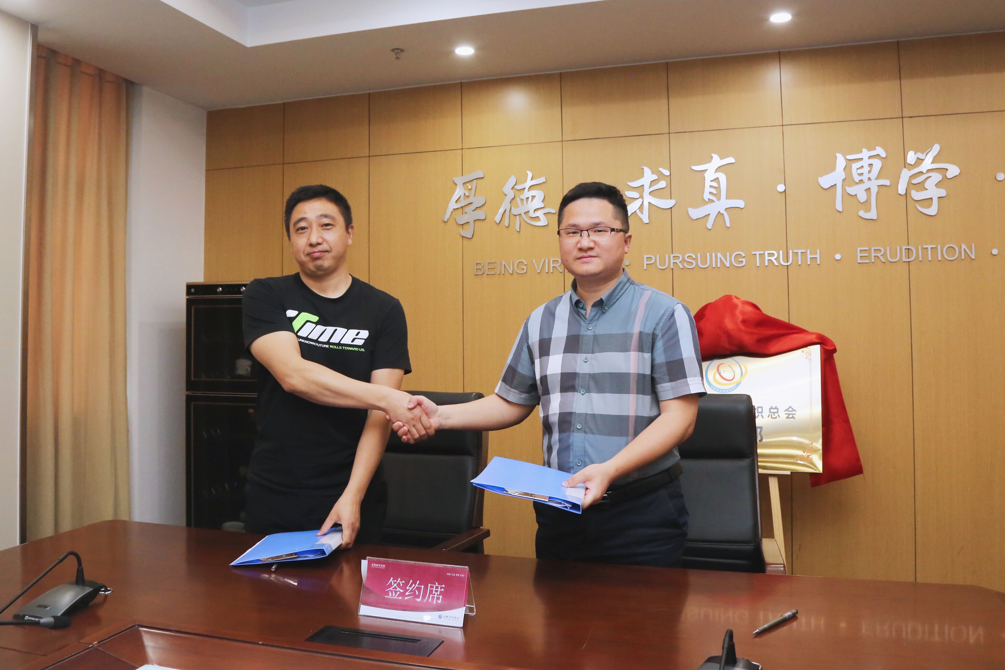 汪祥中、贺行佳代表双方单位签订合作协议。