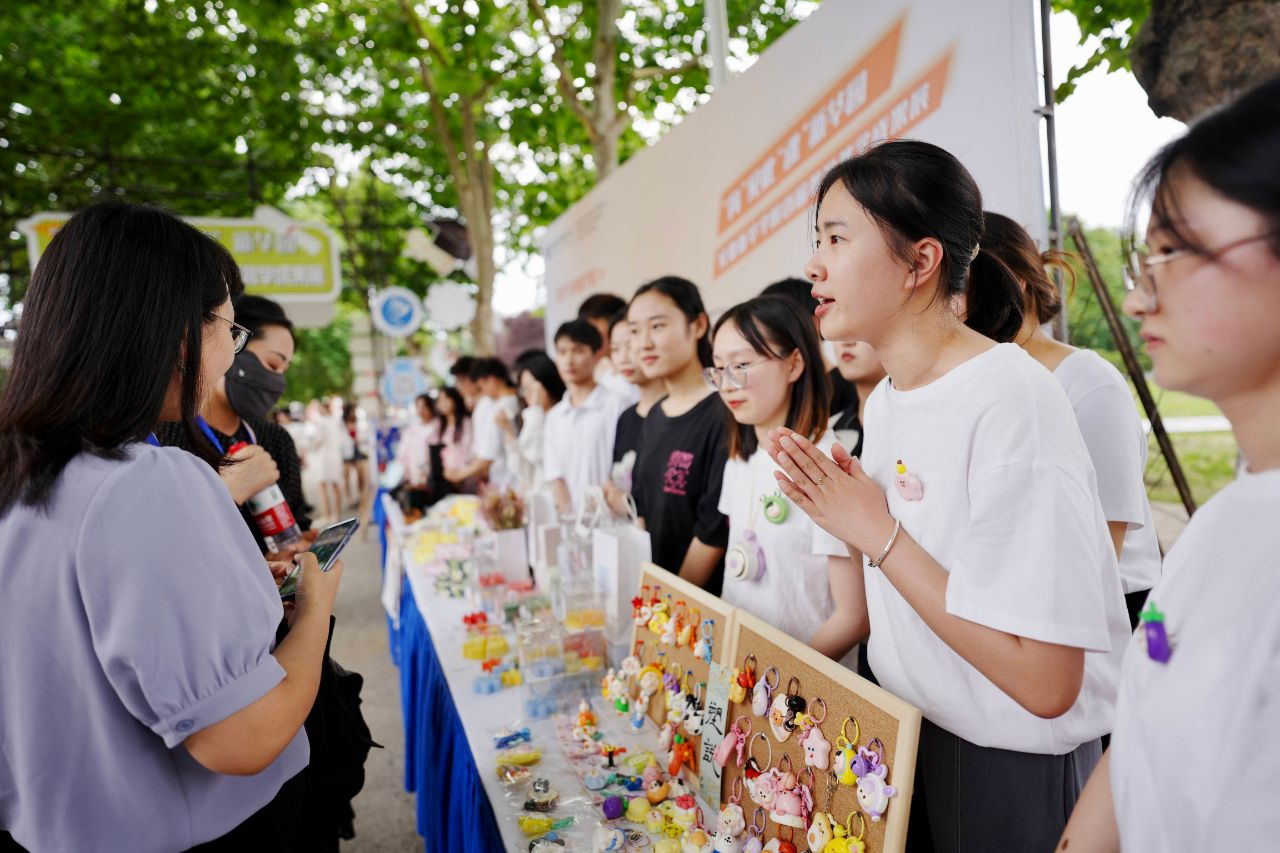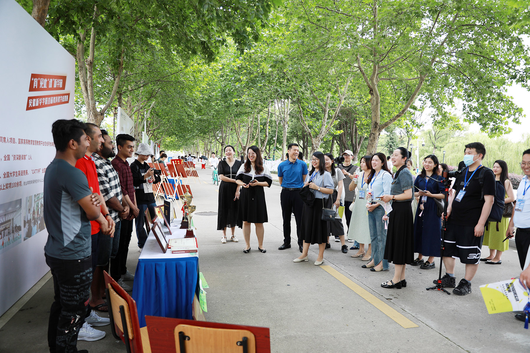 启动仪式结束后,媒体记者来到秋实路观看教育教学成果展。“大家看到的是我们大数据与人工智能学院的IP们,全部是我们《媒体创意与策划》课程上老师和同学们共同创作出来的,包括贴纸、徽章、学院服等,不仅投入了市场还获了奖!”“以布艺为媒介,运用扎染技术进行再创意,将材料与肌理重组,再加麻绳和珍珠进行点缀,这些作品是《幼儿美术制作与技法》的课程改革成果。”“我们开设了《学科竞赛早知道》选修课、举办了‘教授喊你来竞赛’活动,同时注重课程改革,实施‘金课·金奖’计划,让‘金课’助力‘金奖’。”自制中草药香囊、智能车、无人机、无人艇、IP手作、写生作品等课堂成果为媒体记者带来了一场“沉浸式”的深度体验,更有正在备赛的龙舟队意气风发、奋力划桨,激起一湖碧波荡漾,吸引了媒体记者们驻足观看和采访。“确实很不错!琳琅满目的课堂成果,扑面而来的青春气息,热情洋溢的校园生活,特色鲜明的办学优势,都是我们宣传报道的好素材!”合肥日报传媒集团记者陈家静说。
