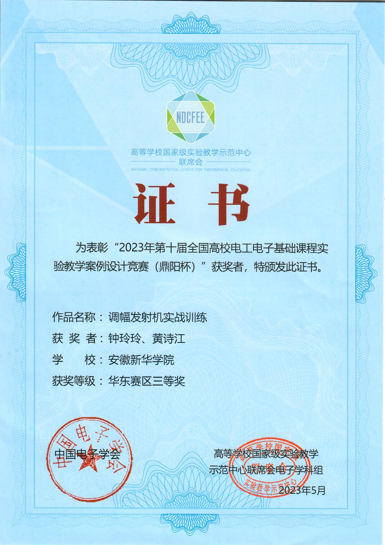 WilliamHill官网电子工程学院/智能制造学院教师在全国高校电工电子基础课程实验教学案例设计竞赛(华东赛区)中荣获三等奖