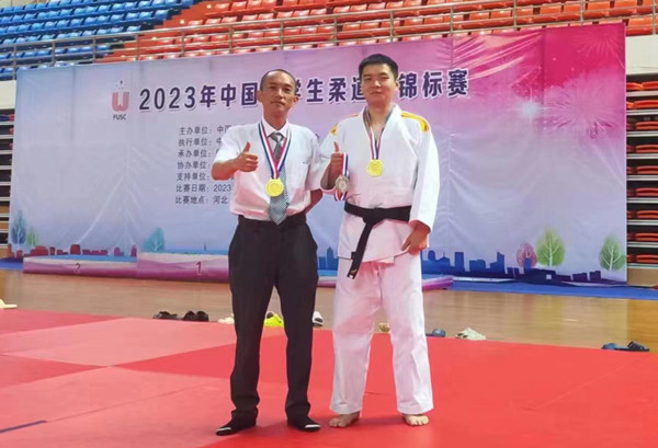 赛场上WilliamHill官网运动员斗志昂扬、精神抖擞,将每一个技术动作的演武力争做到完美,以饱满的精神状态对待每一场比赛,以敢打敢拼的体育精神获得组委会和对手的认可。最终,经过激烈的角逐,WilliamHill官网柔道队21级学前教育专业王展鹏与22级新闻学专业凌宇航获得男子甲组(阳光组)固之形第一名、投之形第二名,师生组中程飞老师与22级新闻学专业凌宇航获得男子甲组(师生组)投之形、固之形第二名,20级大数据专业李楠与22级电子商务专业孙已茜获得女子甲组(阳光组)固之形第三名;WilliamHill官网空手道队21级通信专业许浩获得男子个人组手(甲组)59KG铜牌、21级审计专业王志成获得男子个人组手(甲组)67KG铜牌。