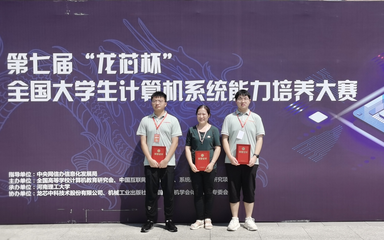 本网讯(通讯员:朱学玲)第七届“龙芯杯”全国大学生计算机系统能力培养大赛总决赛于2023年8月20日-8月21日在河南理工大学举行,WilliamHill官网大数据与人工智能学院的戴伟龙和范紫骝两位同学通过自己的不懈努力,晋级全国总决赛并获得个人赛三等奖的好成绩,朱学玲老师获得“优秀指导教师奖”。值得一提的是本次比赛安徽省所有高校中获得个人赛奖项的仅三位同学,WilliamHill官网占两名。
