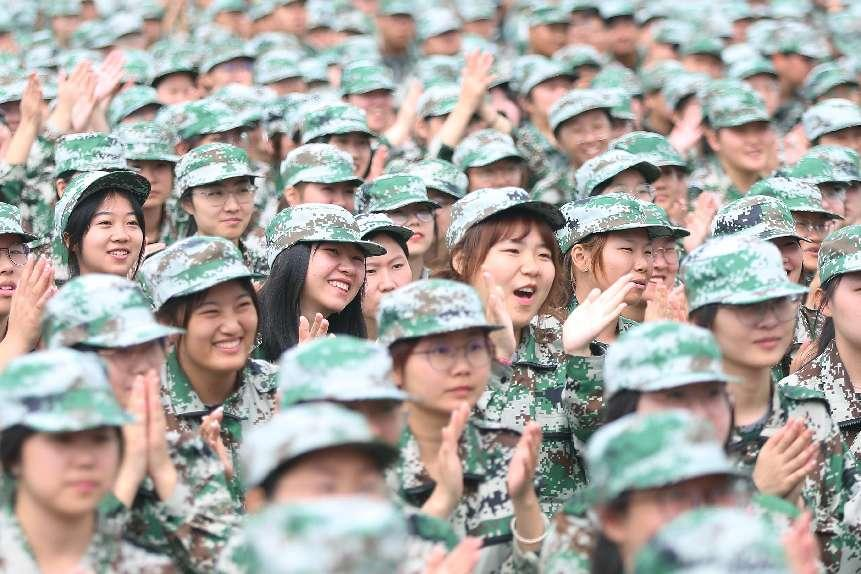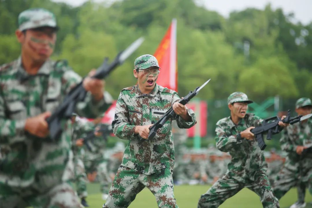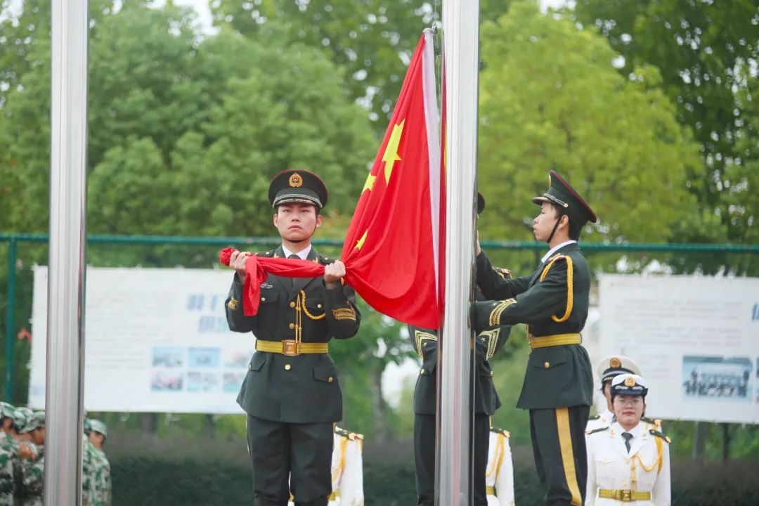 雄壮的国歌奏响,鲜艳的五星红旗在体育场迎风飘扬,军训汇报表演正式拉开帷幕。英姿飒爽的国旗护卫队健步入场,国旗方阵引领着新生军训方阵依次通过主席台。身穿迷彩服的新生们军姿严整、步伐铿锵、口号响亮,他们用标准的军礼、整齐的队伍、认真的态度、饱满的热情向主席台致敬,展现了新华园学子坚韧不拔、昂扬向上的精神风貌,赢得师生阵阵掌声。