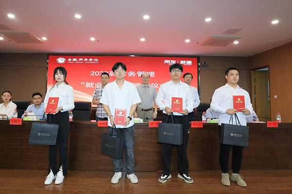校企双方领导为荣获新华•用友校企奖学金学生代表进行颁奖。