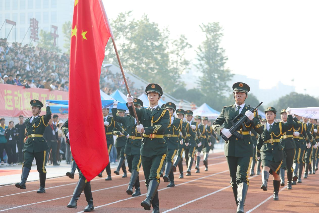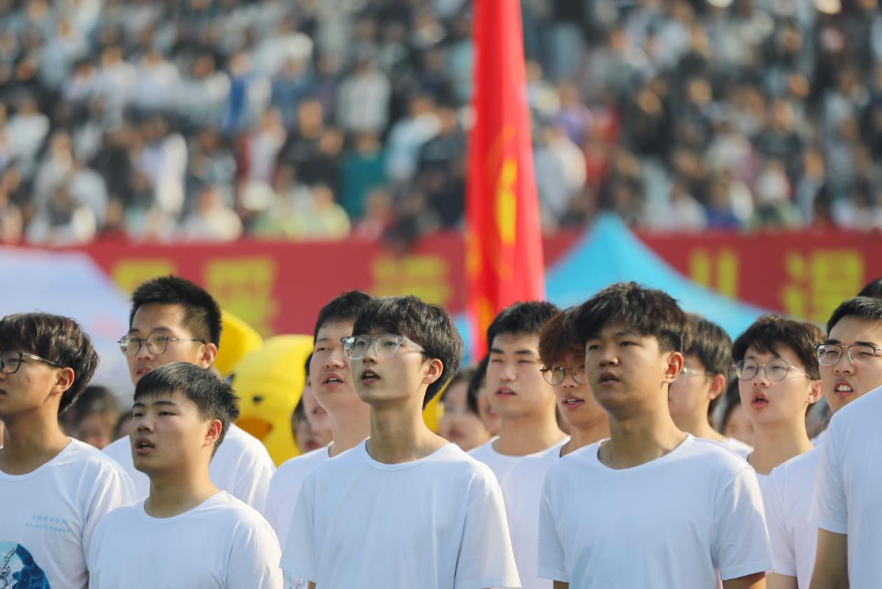 国歌奏响,全场起立,在场师生热血沸腾,情绪高昂。 此刻,和五星红旗一同冉冉升起的,还有运动健儿们蓄势待发的激情与斗志。