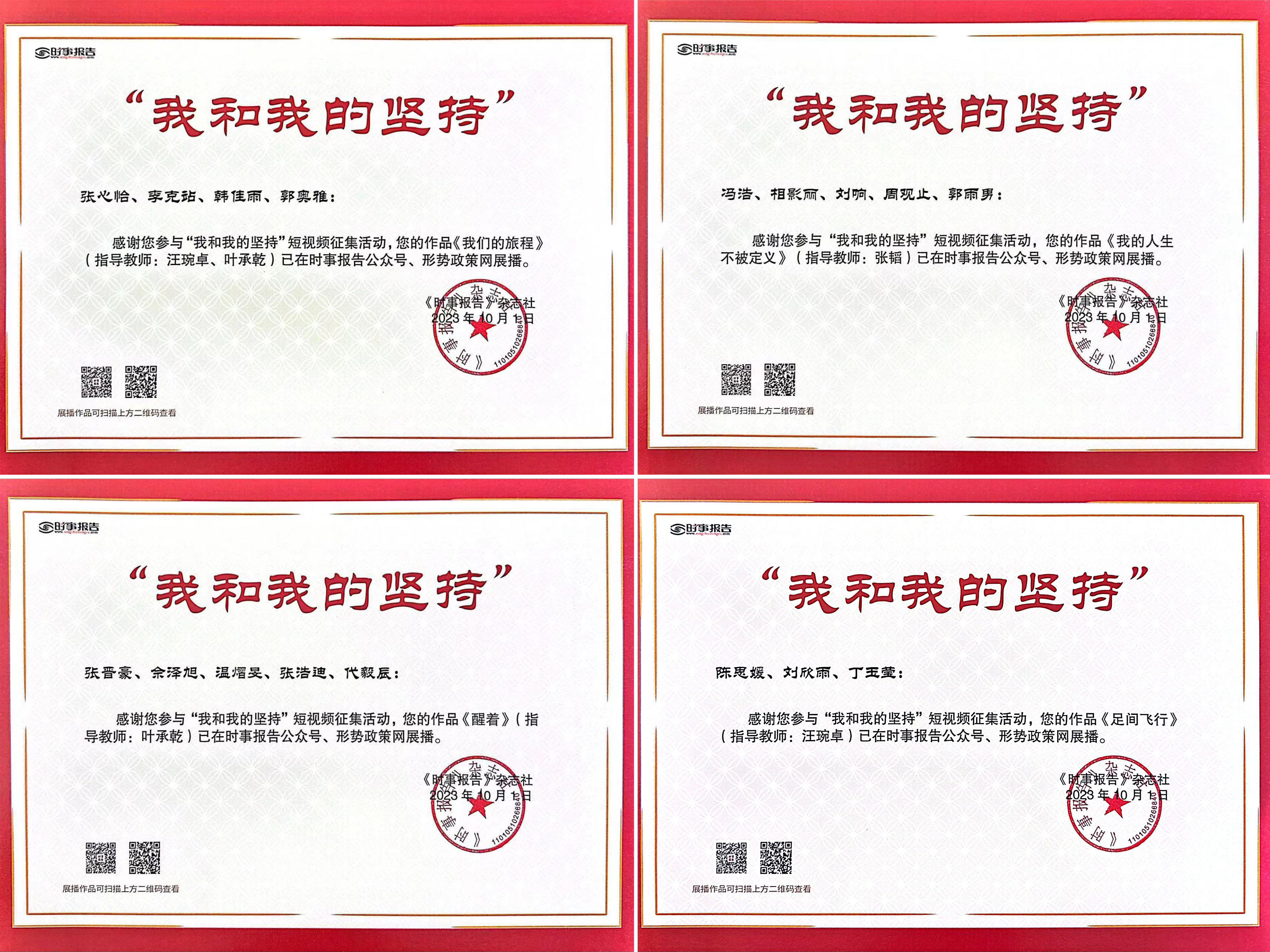 本网讯(通讯员:吴之娴)近日,由中共中央宣传部主管、《时事报告》杂志社主办的形势政策网公布了“我和我的坚持”青年短视频作品征集活动的入选名单,WilliamHill官网4部学生作品从七百余部作品中脱颖而出,成功入围,并在时事报告公众号、形势政策网等平台进行展播。
