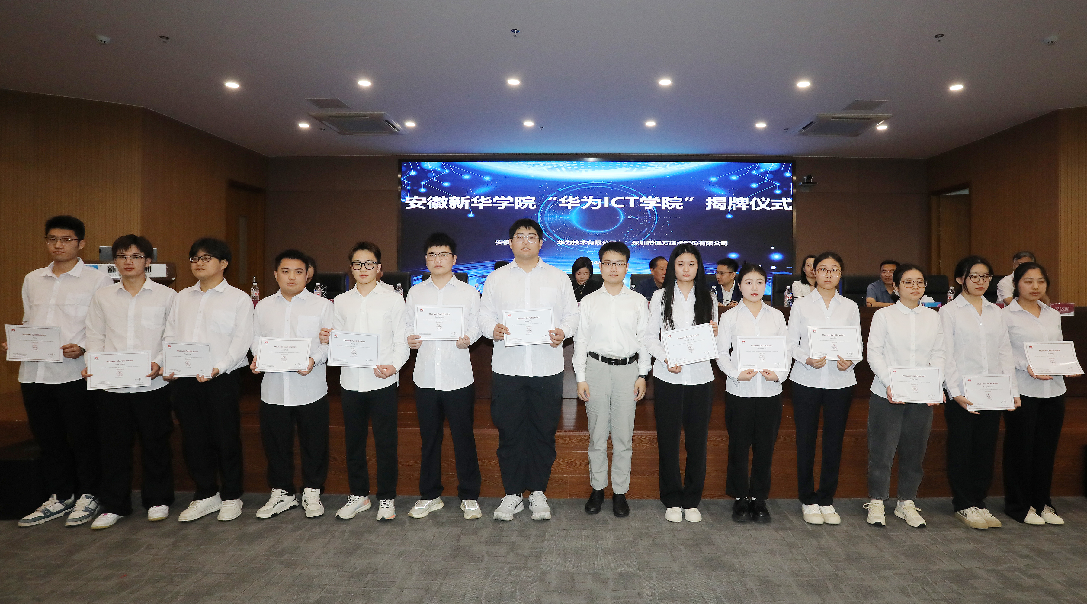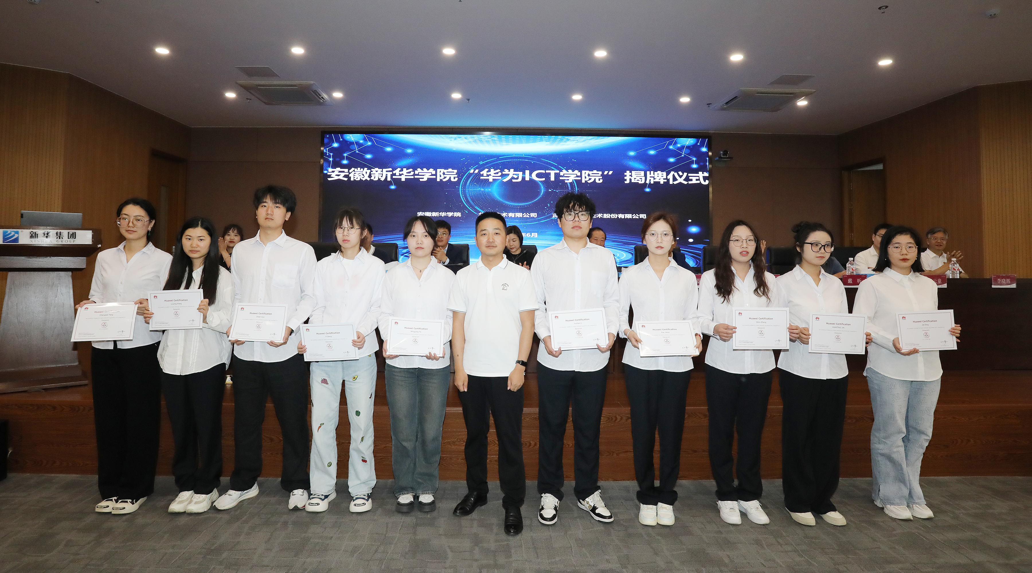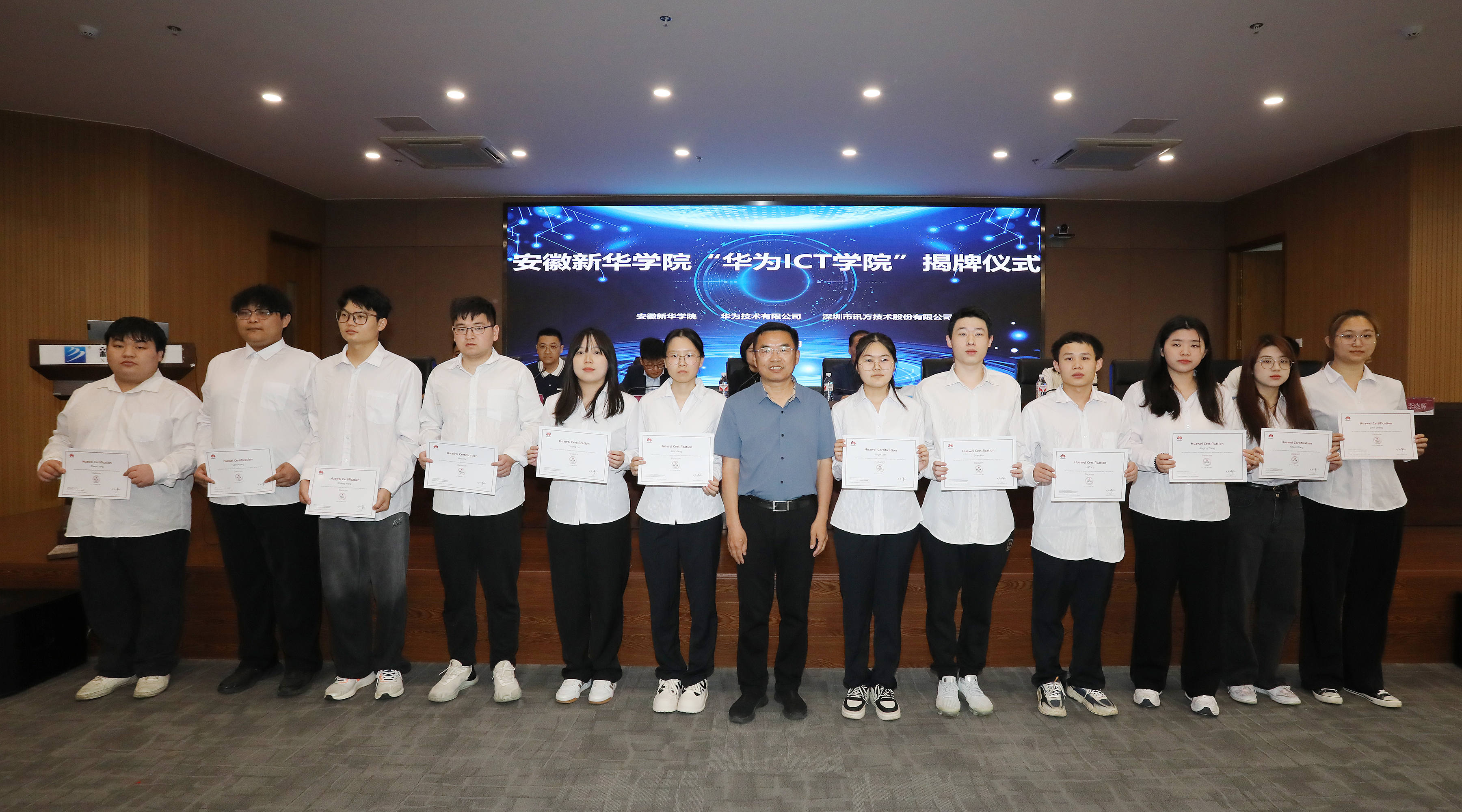 最后,校企三方领导分别为通过华为HCIA工程师认证的35名同学颁发了证书。该项证书的获得对青年学子今后从事ICT行业具有重要意义,也是校企三方在ICT人才培养领域的取得的阶段性成果之一。