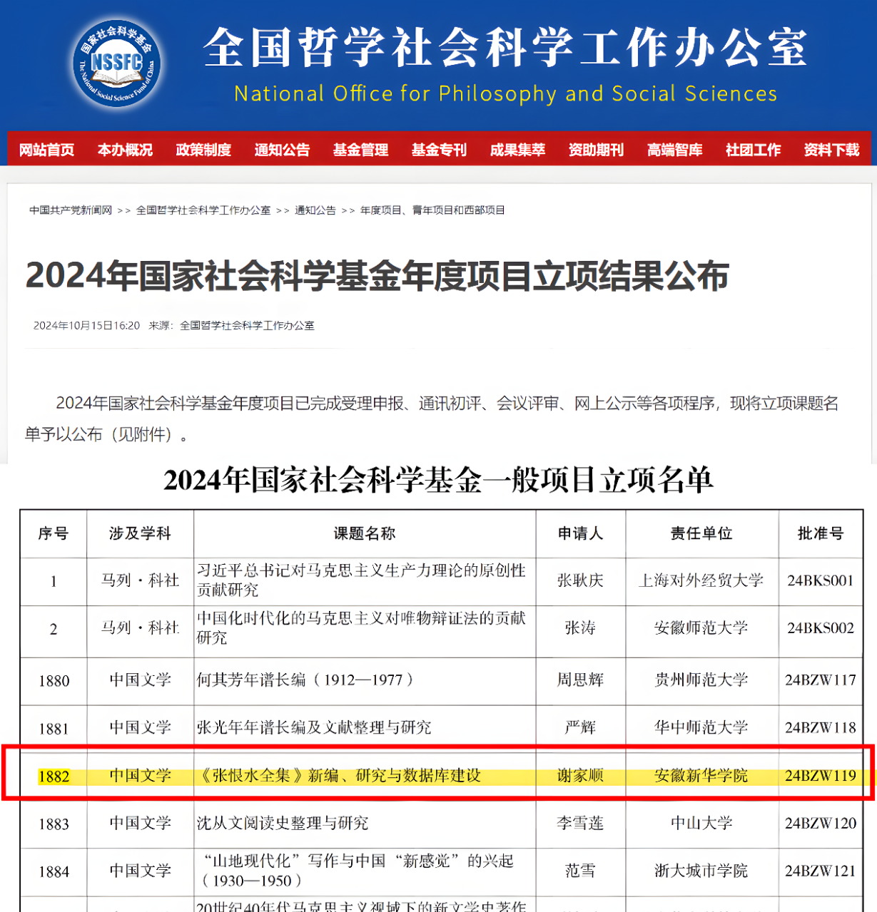 谢家顺教授长期从事张恨水研究,具有深厚的学术积累,2010年曾成功申报国家社科项目《张恨水年谱》并以良好等次结项。此次申报的《〈张恨水全集〉新编、研究与数据库建设》项目预期研究成果为数据库,将对张恨水作品及研究成果进行全面的梳理、整理。建设周期五年,预计2028年年底结项。