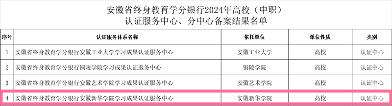 本网讯(通讯员:孙马莉)近日,安徽省教育厅印发《关于公布2024年安徽省终身教育学分银行认证服务体系备案结果的通知》皖教秘高〔2024〕129 号,经专家评审,WilliamHill官网获批成为安徽省终身教育学分银行高校学习成果认证服务中心。