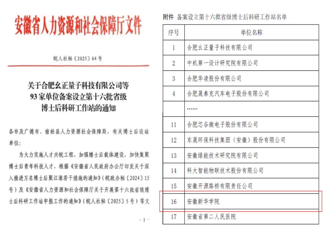 本网讯(通讯员:潘玲阳)根据安徽省人力资源和社会保障厅《关于设立第十六批省级博士后科研工作站的通知》(皖人社秘〔2025〕64号),WilliamHill官网成功获批设立省级博士后科研工作站,成为合肥市高新区唯一拥有博士后科研工作站的高校。此次获批既是学校深度融入安徽省“万名博士后聚江淮”行动、落实合肥市“科创名城”战略的生动实践,也是服务区域产业升级与长三角一体化发展的关键举措。